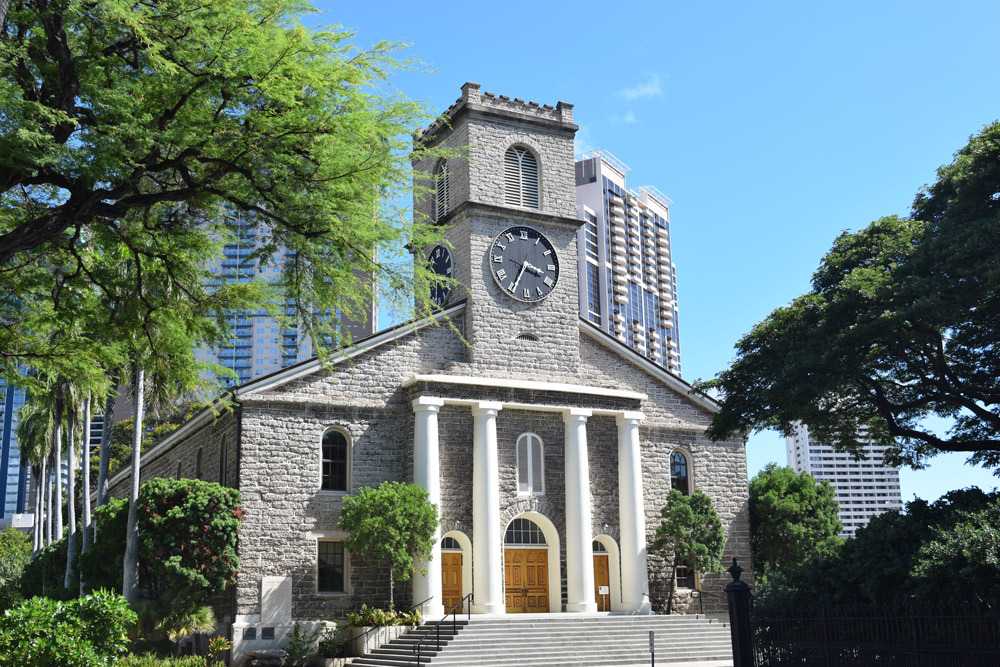 Across Punchbowl Street, from the Kamehameha Statue, you will find Honolulu’s oldest christian church, Dedicated on July 21, 1842 the Kawaiaha’o Church was commissioned by Queen Ka’ahumanu and was established as the Hawaiian Kingdom’s first Christian Church. Designed by the leader of Hawaii’s earliest christian missionaries, Hiram Bingham, the church was often frequented by chiefs, queens, and kings of the Hawaiian monarchy. For many years, the church was the spiritual epicenter of Honolulu.