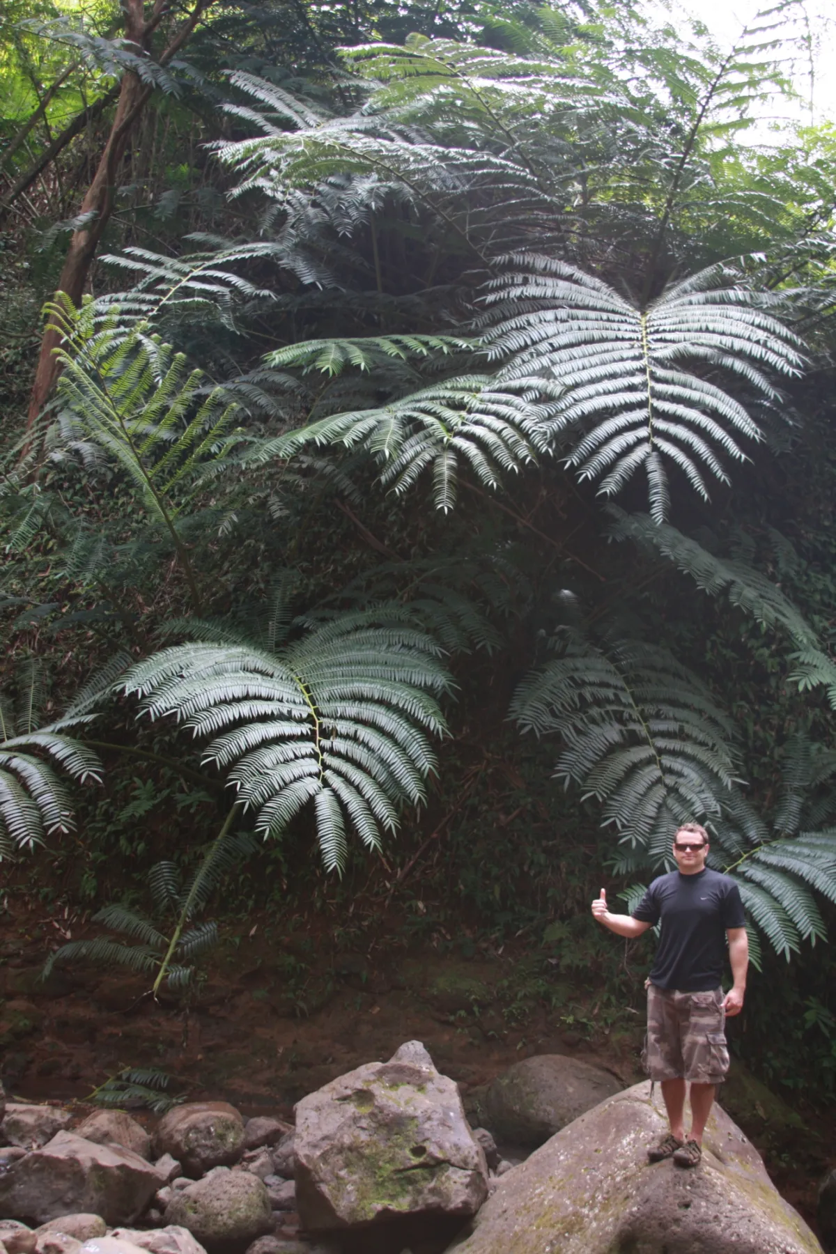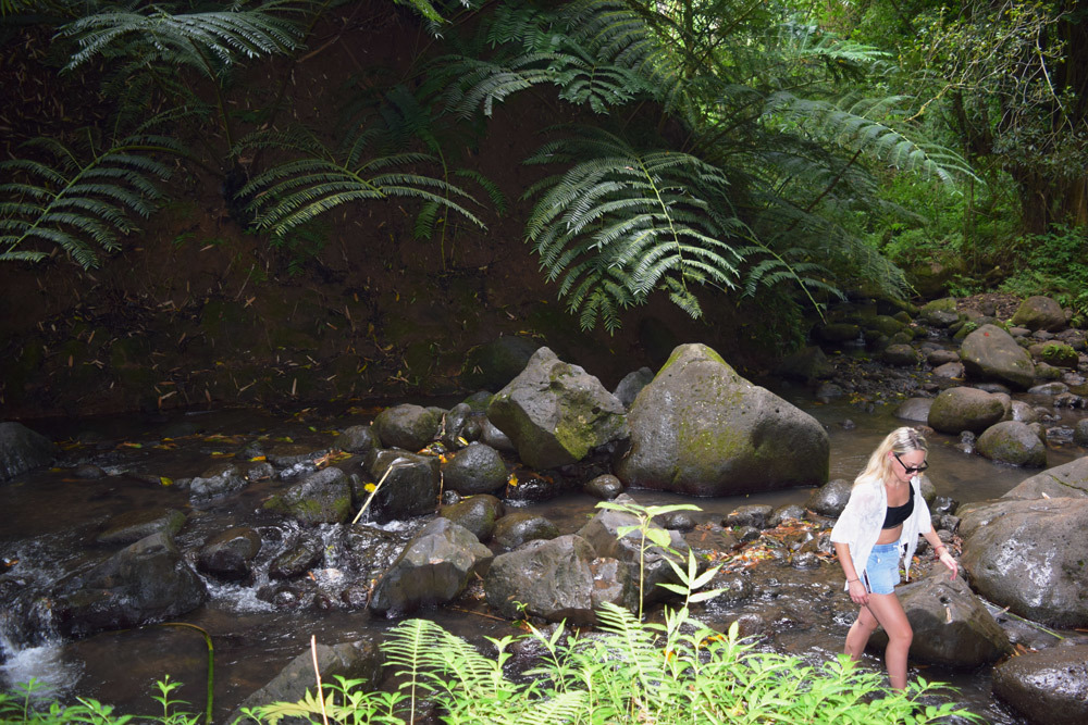 You will then begin your 0.75 mile descent of 550ft (about 20-30 minutes) and once at the bottom, you're in the Maunawili Stream. Here, start to walk upstream. The trail starts on the left side of the stream and proceeds to cross the stream multiple times. Many hikers choose to simply walk up the middle of the stream, rock hopping as they go.