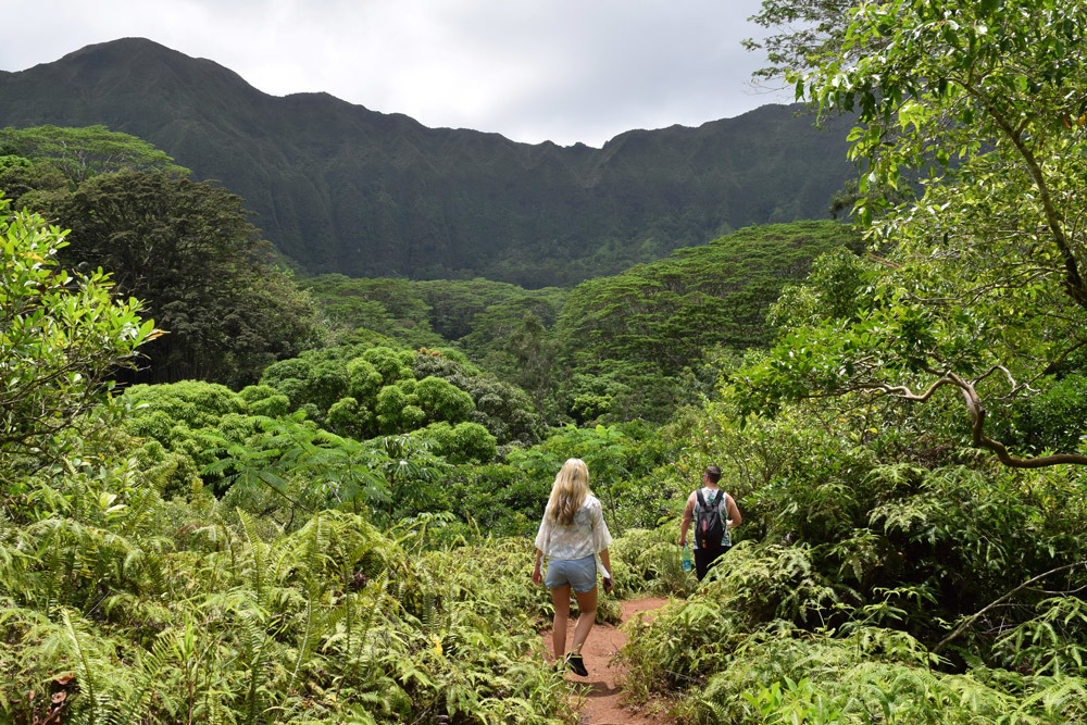 The new hiking route is about 5 miles round-trip and takes about 5-6 hours. The trail is mostly a shaded ridge that descends into and follows a stream, so it can be muddy in some areas. Be sure to wear sturdy shoes and bring plenty of water and snacks. This small waterfall and swimming hole is a local favorite for both residents and visitors alike and is a great place to cool off on a hot Hawaii day.
