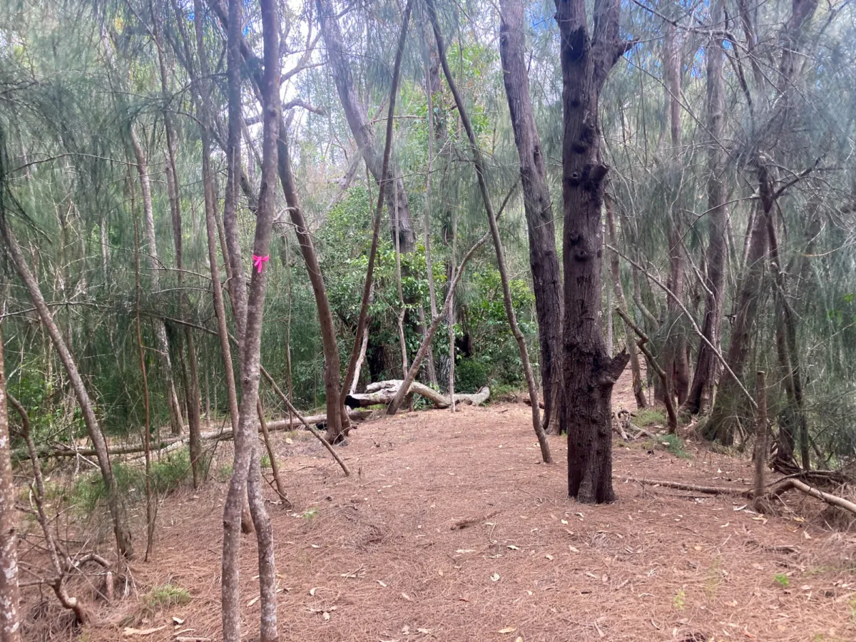 At one point, a chain-link fence appeared on our left, a critical marker for your return trip. Make sure this fence is on your right when heading back; otherwise, you might wander out of the wrong exit, not so close to your stating point. Passing the fence, we re-entered the thick ironwood forest. Here, the real climb began, 600 feet of elevation gain within the first mile. Once out of the ironwood pine, Cook pines towered above us, their distinctive silhouette a reminder of their introduction to Hawaiʻi during the plantation era as windbreaks.