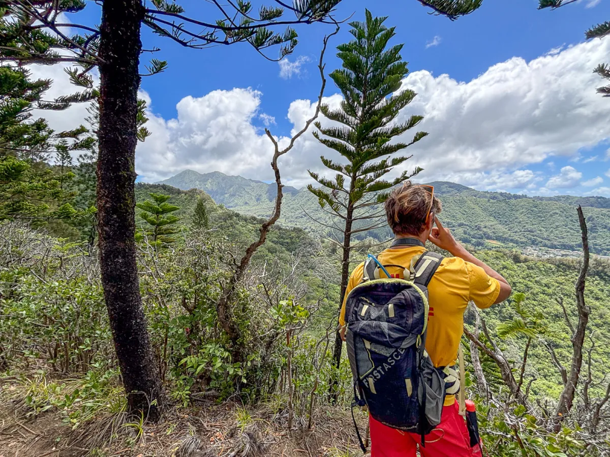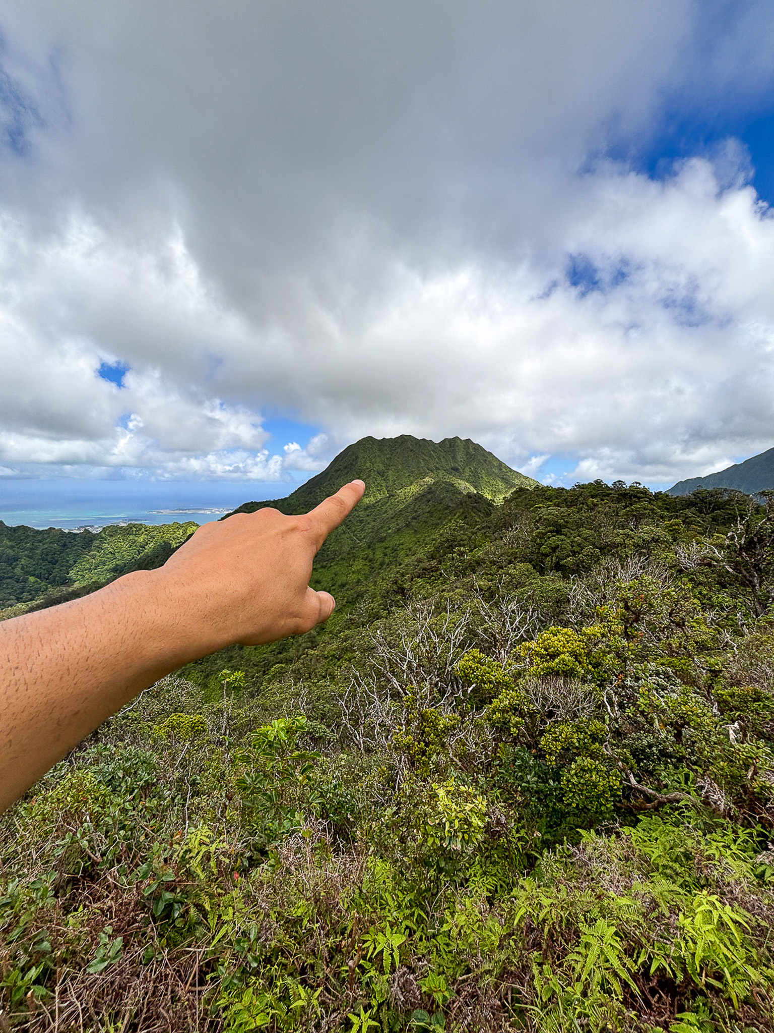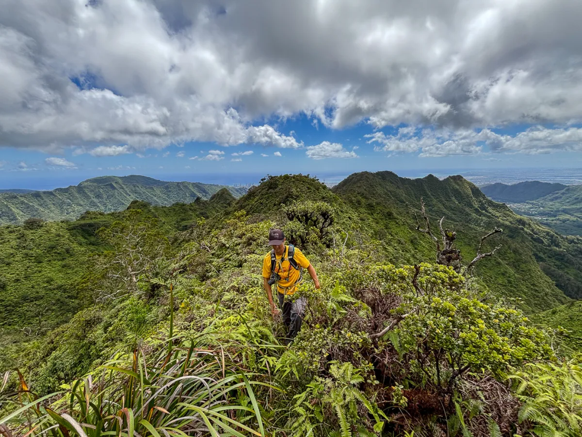 Sean reached the summit first, and I followed, cresting the ridge to a breathtaking panorama of both urban Honolulu and windward Oahu. We were now standing atop Puu Lanihuli, whose name translates to “swirling heavens,” and is steeped in cultural significance as one of the sacred peaks in the Koʻolau Range, often shrouded in mist believed to carry the presence of ancestral spirits. However, lucky for us, it was completely clear on the day we hiked it. Standing atop this revered peak, it was easy to feel the deep connection between the natural world and the stories that have shaped its history.