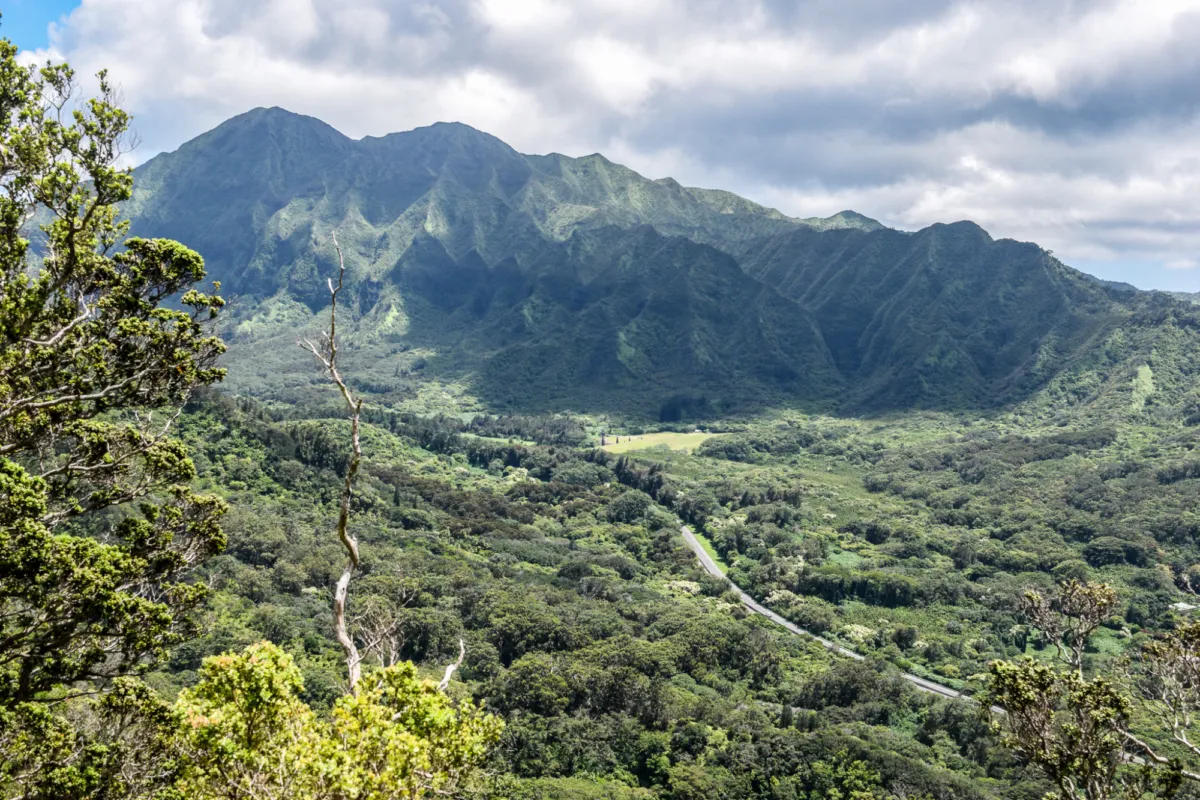 Under their canopy, we spotted a blooming ʻieʻie flower, its striking orange and yellow hues a highlight of the climb. In Hawaiian tradition, the ʻieʻie vine was prized for its strength and flexibility, often woven into hīnaʻi (baskets) and fish traps essential for daily life. Higher still, the Pali Highway snaked through Nuʻuanu Valley below, weaving its way past the Nuʻuanu Reservoir, a key part of Oʻahu’s water system since the early 1900s.