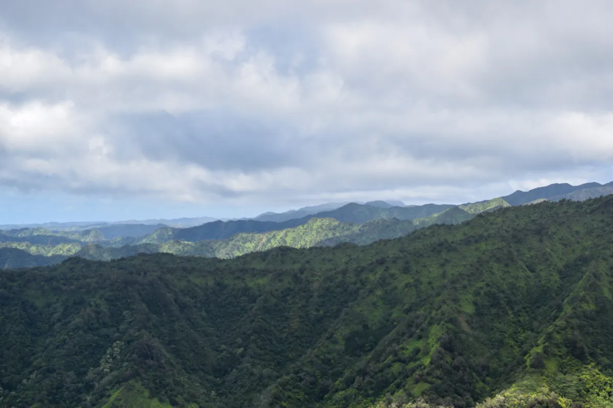 After a brief plateau, we paused to rest, taking in our first breathtaking glimpse of Windward Oʻahu through the Kalihi Saddle, with the striking "Shark Fin" peak standing out as the most iconic feature.