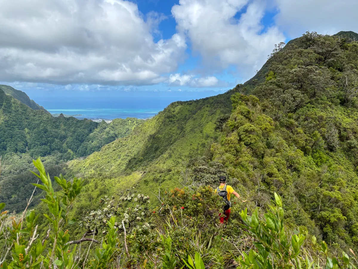 The final push to the summit was a grueling half-mile climb with 600 feet of elevation gain. With grades reaching 70%, it tested our legs and resolve. But as the Kalihi Saddle came into sharper focus, we were rewarded with deeper views of East Oʻahu, including Mokoliʻi (Chinaman’s Hat Island) far below.