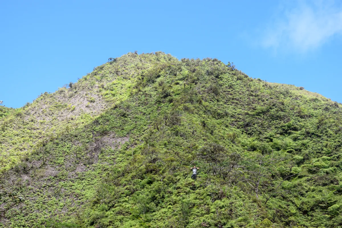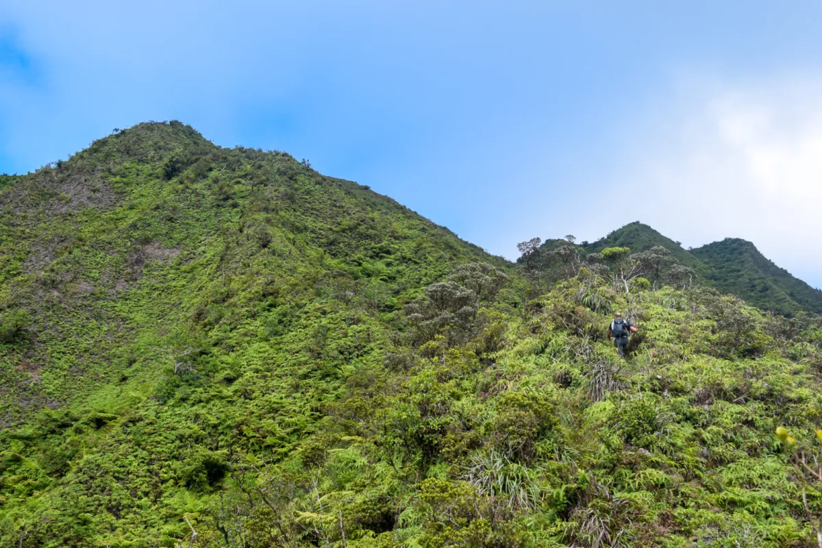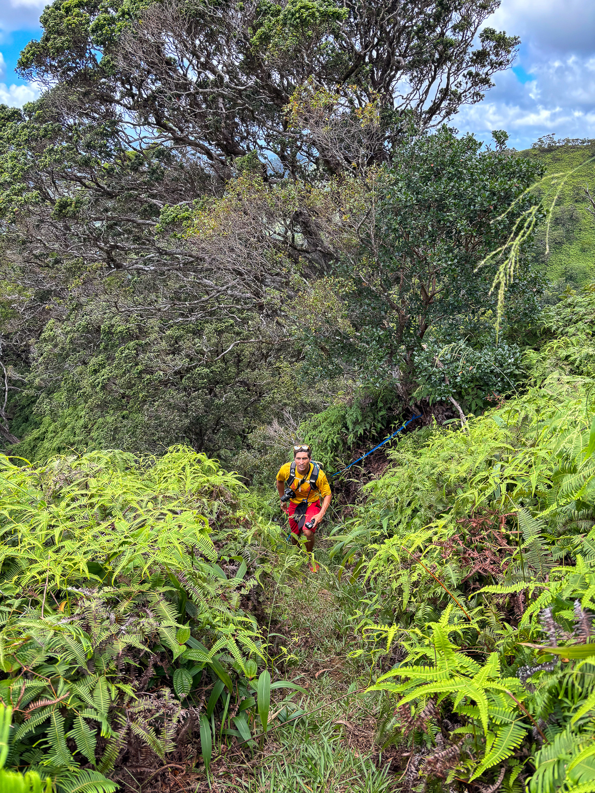 But the respite was short-lived as the trail resumed its aggressive incline. More ropes helped us navigate the steep sections, each pull bringing us closer to our goal. Cresting a hill, we finally saw Puu Lanihuli ahead.