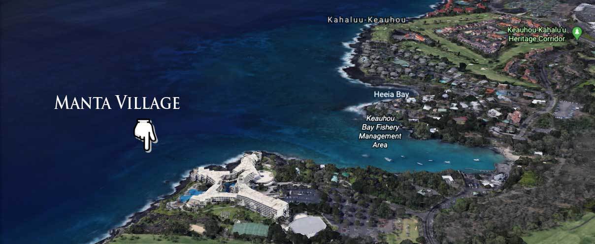 Manta Village - Located just off the coast of Sheraton Keauhou Bay Resort and Spa. Manta Village is the most convenient and popular spot for manta ray viewing. Annually, Manta Village has the highest manta sightings and is the standard location for night snorkeling and scuba diving tours. The Sheraton sits right in Keauhou Bay, where the Sailing Canoe Manta Ray Snorkel departs each evening. From there, it’s only a short 15-minute ride in a small traditional Hawaiian sailing canoe to reach the lights of Manta Village, a peaceful, cultural way to experience the same world-famous manta encounter just offshore.