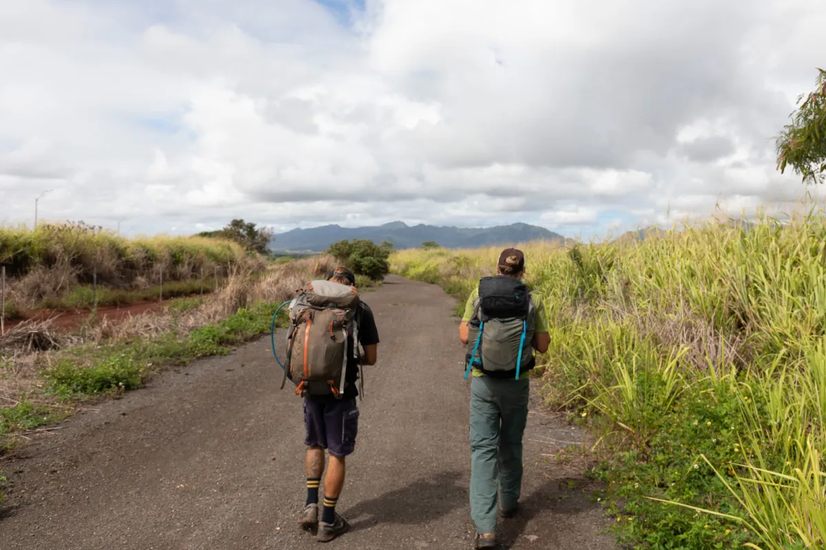 Our conversation buzzed with excitement over recent reports that the trail had been cleared by the Hawaiʻi Trail and Mountain Club (HTMC), making us eager to enjoy it in its most navigable condition. For the first 1.4 miles, the gravel road skirted the Helemano Military Reservation housing area, offering an interesting glimpse into family life on a military base.