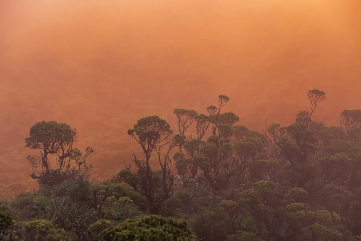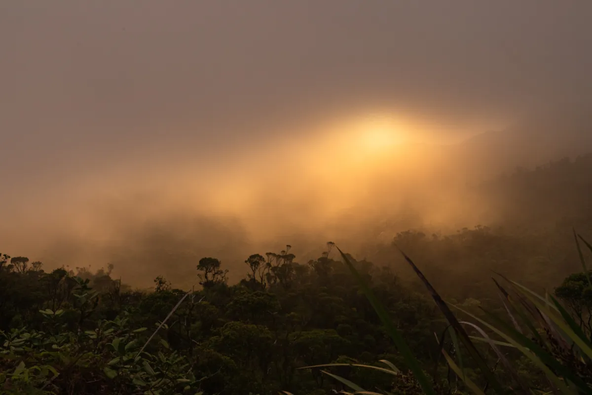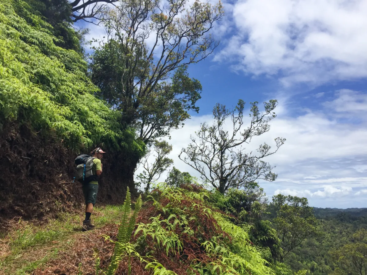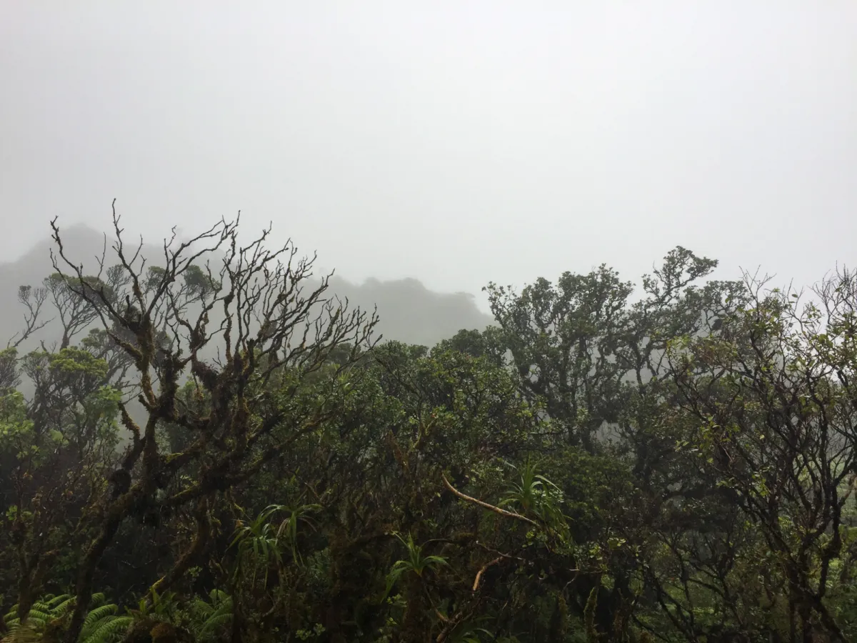 After 5–10 minutes, the phenomenon ended as abruptly as it began. The fiery glow faded, leaving us in the cool, damp darkness of twilight. Still trying to wrap our heads around what we had just experienced, we headed into the cabin for some much-needed rest, the memory of the surreal moment etched into our minds. The next morning, we woke to the gentle patter of light rain on the metal roof and found ourselves once again socked in by a cloud. After a quick breakfast, we packed up our gear, tidied the cabin, and even packed out some rubbish that wasn’t ours, always leaving a place better than we found it. With everything ready, we began our descent down the Poamoho Trail.