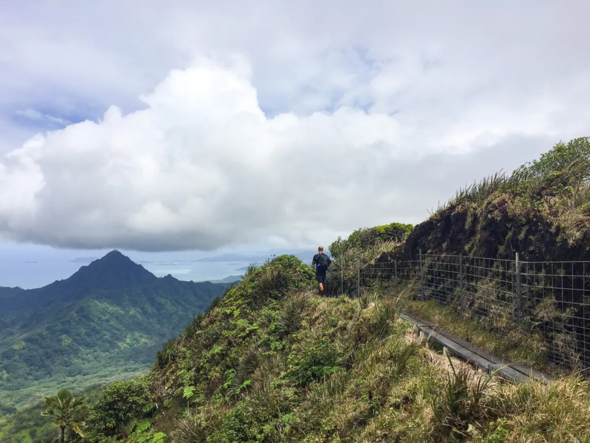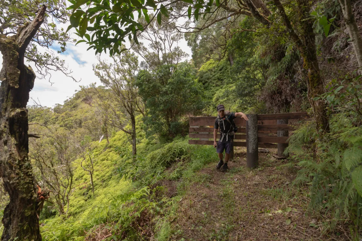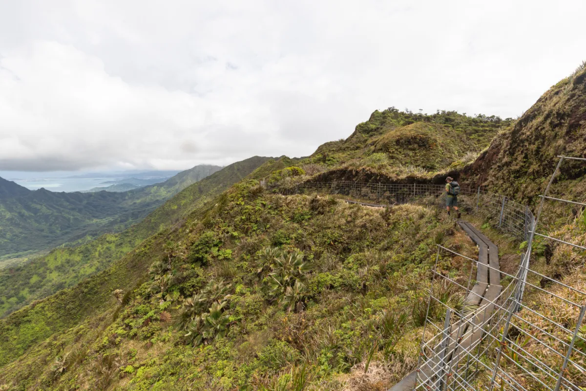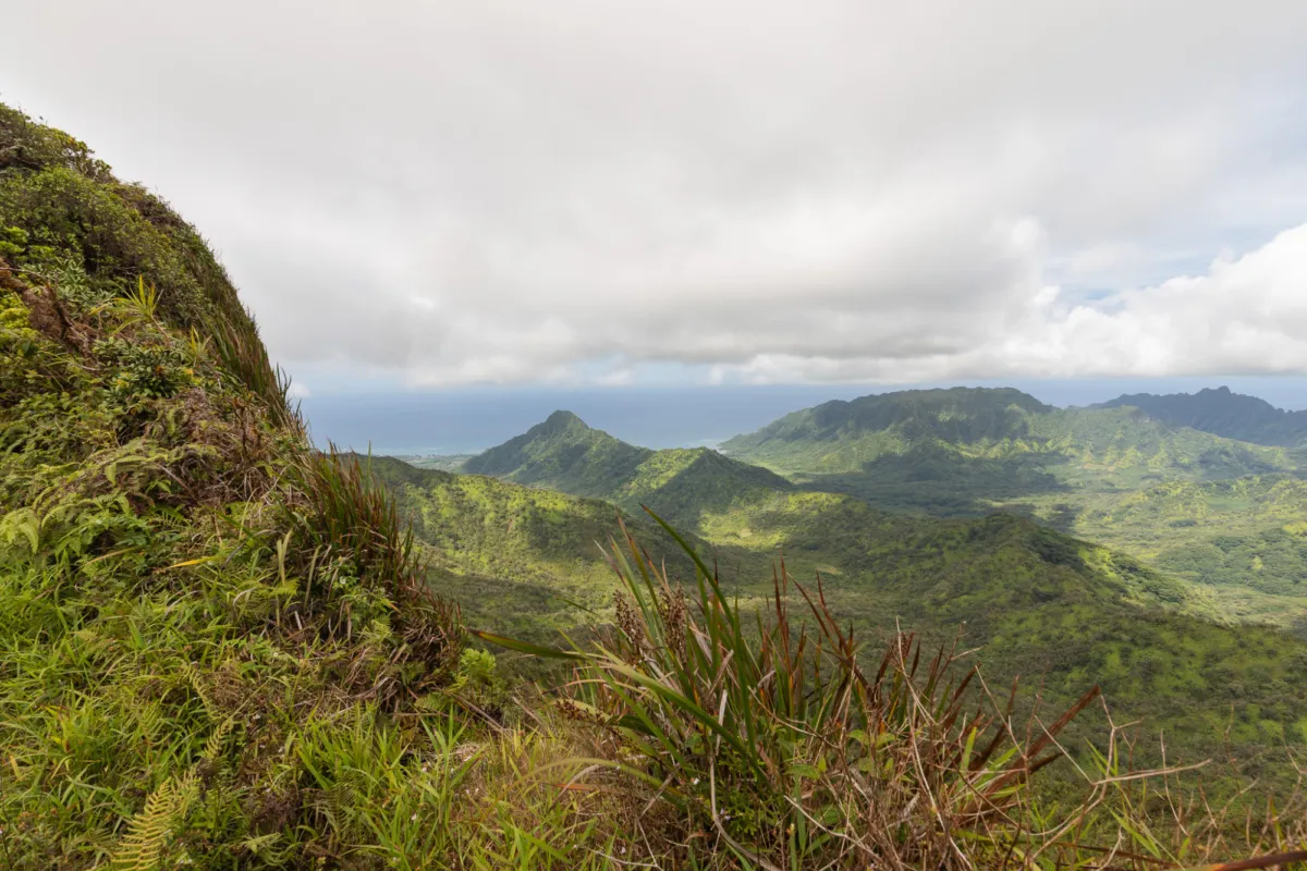 We soon reached a large wooden gate designed to keep motorbikes off the trail. After a quick wiggle around it, the trail began to open up as it hugged the ridge line with sheer cliffs off to the side, which offered expansive views of Oʻahu’s interior.