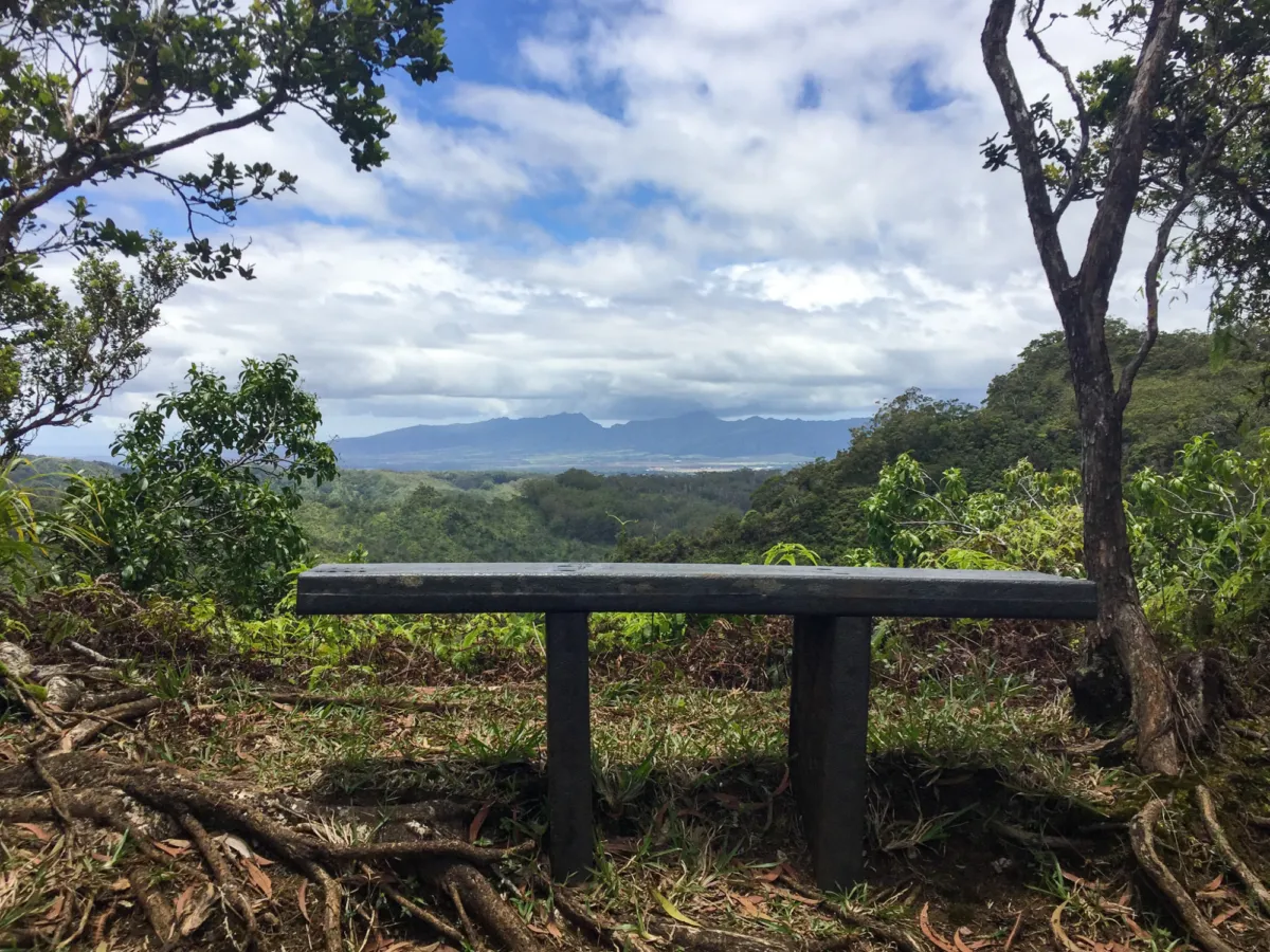 Rounding the corner a little further, we came across a well placed bench. This was a perfect spot for us to take a hard earned break and enjoy a quick snack and stretch before continuing. From this vantage point, we could see all the way to the Waiʻanae Mountain Range, where the distinctive Kolekole Pass stood out prominently. Every time I get such a grand view of the pass, I can’t help but think about its historical significance. On December 7, 1941, Japanese aircraft flew along this very gap (some eyewitness claimed the planes actually flew through the pass) as they launched their surprise attack on Pearl Harbor. The pass served as a hidden, direct route from the North Shore to their first target, Wheeler Army Airfield, before continuing on to Pearl Harbor. Flying low through the mountain pass allowed the Japanese planes to evade detection until the last moments. Looking out, it’s almost surreal to imagine hundreds of warplanes intent on death and destruction swarming through the peaceful and picturesque landscape.