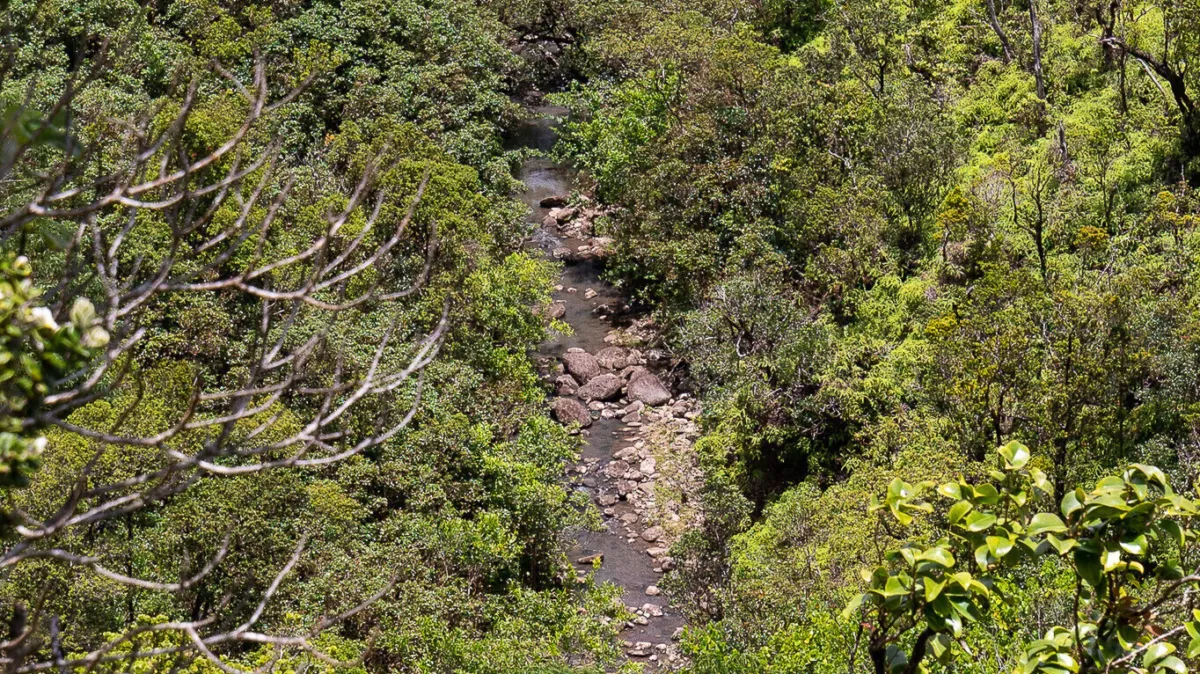 As we continued, the overgrowth became more challenging. Scratchy uluhe ferns stretched across the path, making progress slower and less comfortable. In hindsight, pants would have been a smart choice, as the ferns quickly proved to be rough on our bare legs. This eventually let up as we wound our way down into a sub-valley to cross the Helemano Stream. The trail then ascended out of the mini valley, rewarding us with a stunning view of the Poamoho Stream below. From this height, we could see a series of pools glistening in the sunlight—each one looking like a Hawaiian paradise for a hot day. What a joy it would be to lounge by a cold mountain pool, feeling the rush of running water over your skin, completely secluded in this high-elevation hanging valley. But alas, that enticing side quest would have to wait for another day.