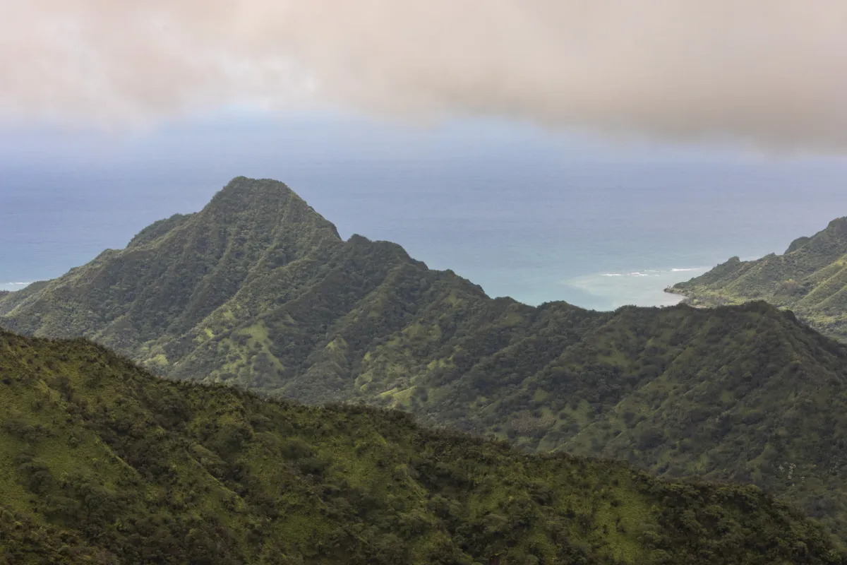 From the summit, we were greeted with tremendous views of windward Oʻahu. Punaluu Valley, Kahana Valley, and Waikane Valley stretched out before us, framed by the jagged ridgelines of Puu Manamana, Puu Piei, and Puu Ohulehule. Beyond, Kaneʻohe Bay shimmered just beneath the clouds, and farther in the distance, the ridges of Makapuʻu came into view.