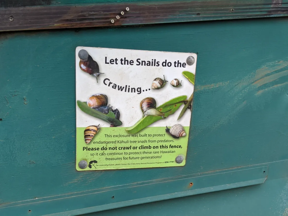 Also in view was a walled off portion of the snail habitat that the earlier sign had mentioned. This area is part of a conservation effort to protect the endangered Kāhuli, or Hawaiian tree snails, which are native to these mountains. These small, beautifully patterned snails play a vital role in maintaining the forest ecosystem by feeding on decaying plant material, helping to recycle nutrients back into the soil. Once abundant, they now face severe threats from habitat loss and invasive predators, making them a symbol of the delicate balance required to preserve Hawaiʻi’s unique biodiversity. It being only about a 0.10 of a mile away, and since we were curious, we walked up to the exclosure for a brief moment. While it was interesting to see the measures taken to protect these rare creatures, there wasn’t much to look at. The snails are small, elusive, and remain hidden in the dense vegetation behind the walls. Still, knowing that we were in their habitat added a deeper sense of connection to the natural world we were traversing.