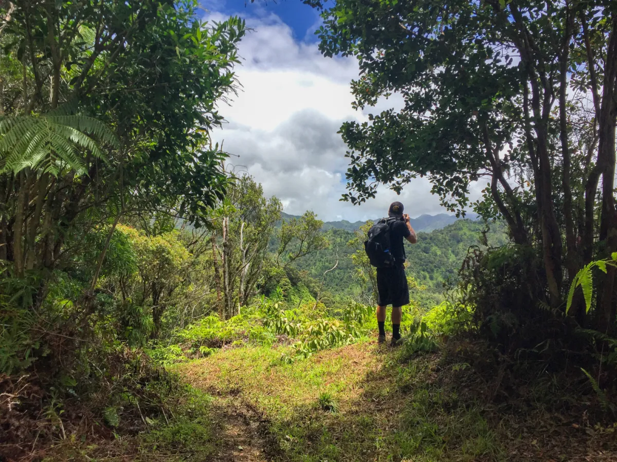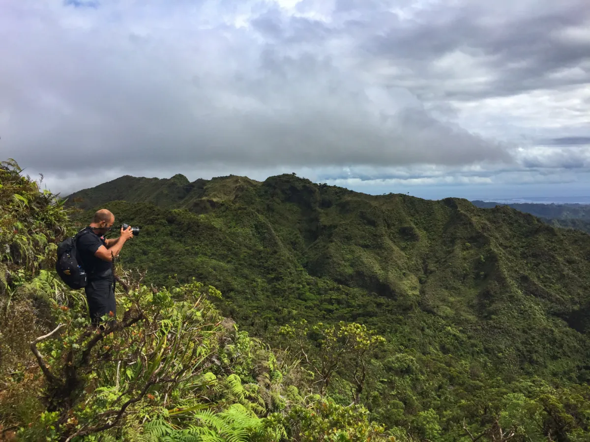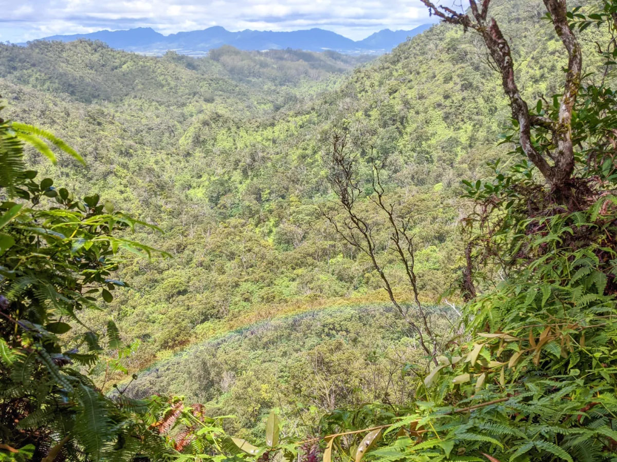 The ground was completely muddy, making the trek slippery and challenging. It took some tactical decisions, and a fair bit of ninja-like agility, to keep our socks dry as we navigated the muck. By now, we had learned how quickly the weather can shift in the Koʻolau Mountains. Sure enough, the fog eventually lifted, revealing clear blue skies and a vibrant Hawaiian rainbow arching across the landscape. From that point on, the weather remained perfect, making for an enjoyable descent back down the trail.