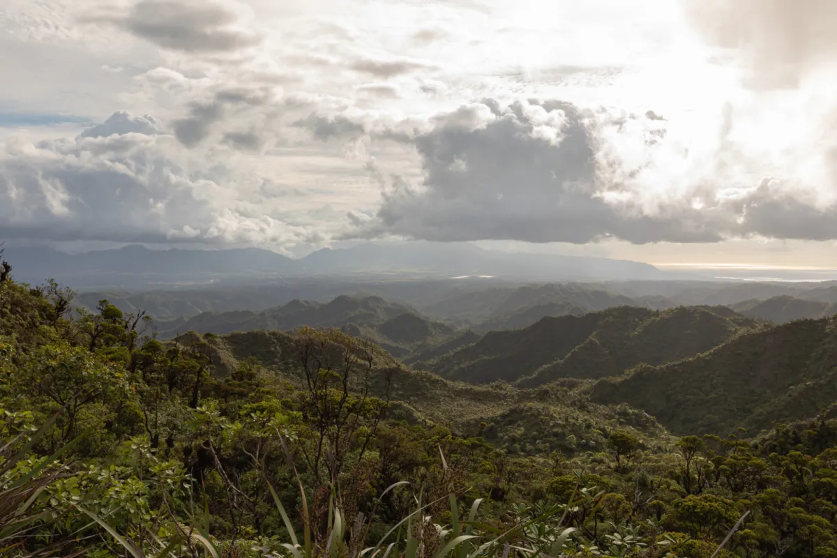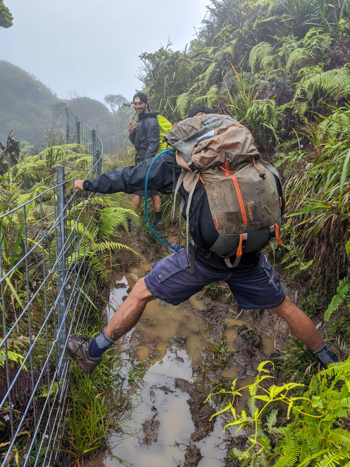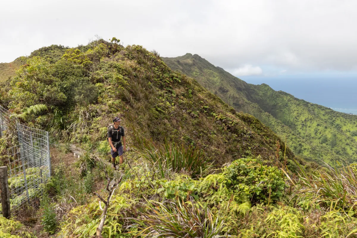 One thing to note was the intensity of the tradewinds, which rushed over the summit like a wind tunnel. It has turned from hot and sticky, to cold and blustery. The strong breezes brought a welcome coolness but made it just uncomfortable enough to discourage us from lingering too long. While the views were awe-inspiring, the high winds reminded us that this summit wasn’t a place for long rests. It was a point to pause, take in the reward of huge windward Oahu views, and move onward. At this point, the trail turned south along the Koʻolau Summit Trail (KST), running alongside a metal fenceline built to protect the native habitat from invasive pigs. This fenceline, installed by the Hawaiʻi Division of Forestry and Wildlife (DOFAW), is part of a larger conservation effort to preserve the delicate ecosystems of the ʻEwa Forest Reserve. The fence protects some of the most intact ʻōhiʻa forests on Oʻahu, home to 34 rare and endangered native plants and animals, from the destructive impacts of feral pigs. The trail itself became muddy and overgrown in sections, but the stunning views made every step worthwhile.