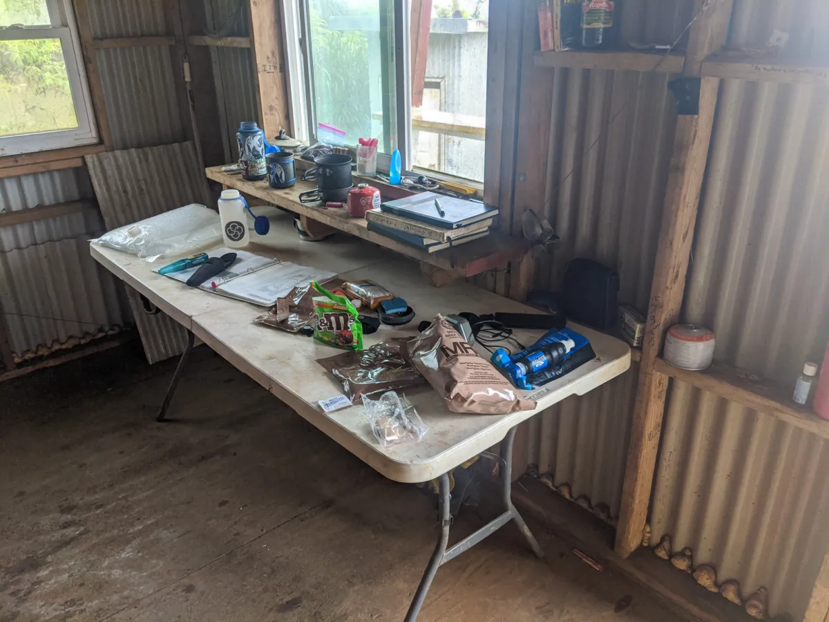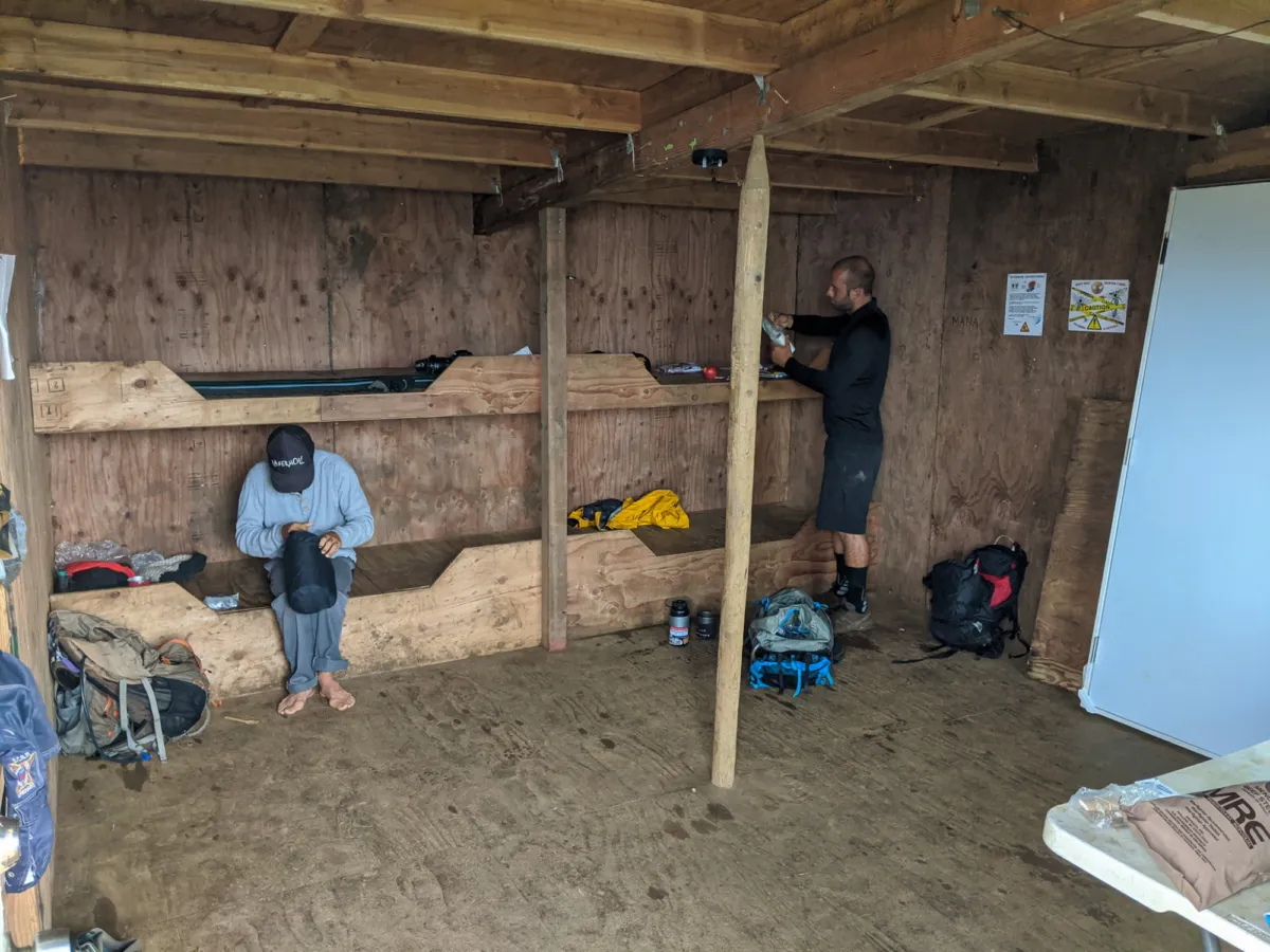 The cabin itself is a simple structure, offering four bunks, a fold-out table, and a nearby outhouse. We quickly set our gear down, unpacked our sleeping pads and bags, and traded our muddy hiking boots for rubber slippahs. After settling in, we turned our attention to cooking a well-deserved meal, enjoying the quiet mountain atmosphere and the golden light of late afternoon streaming through the trees.