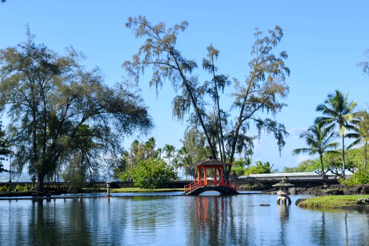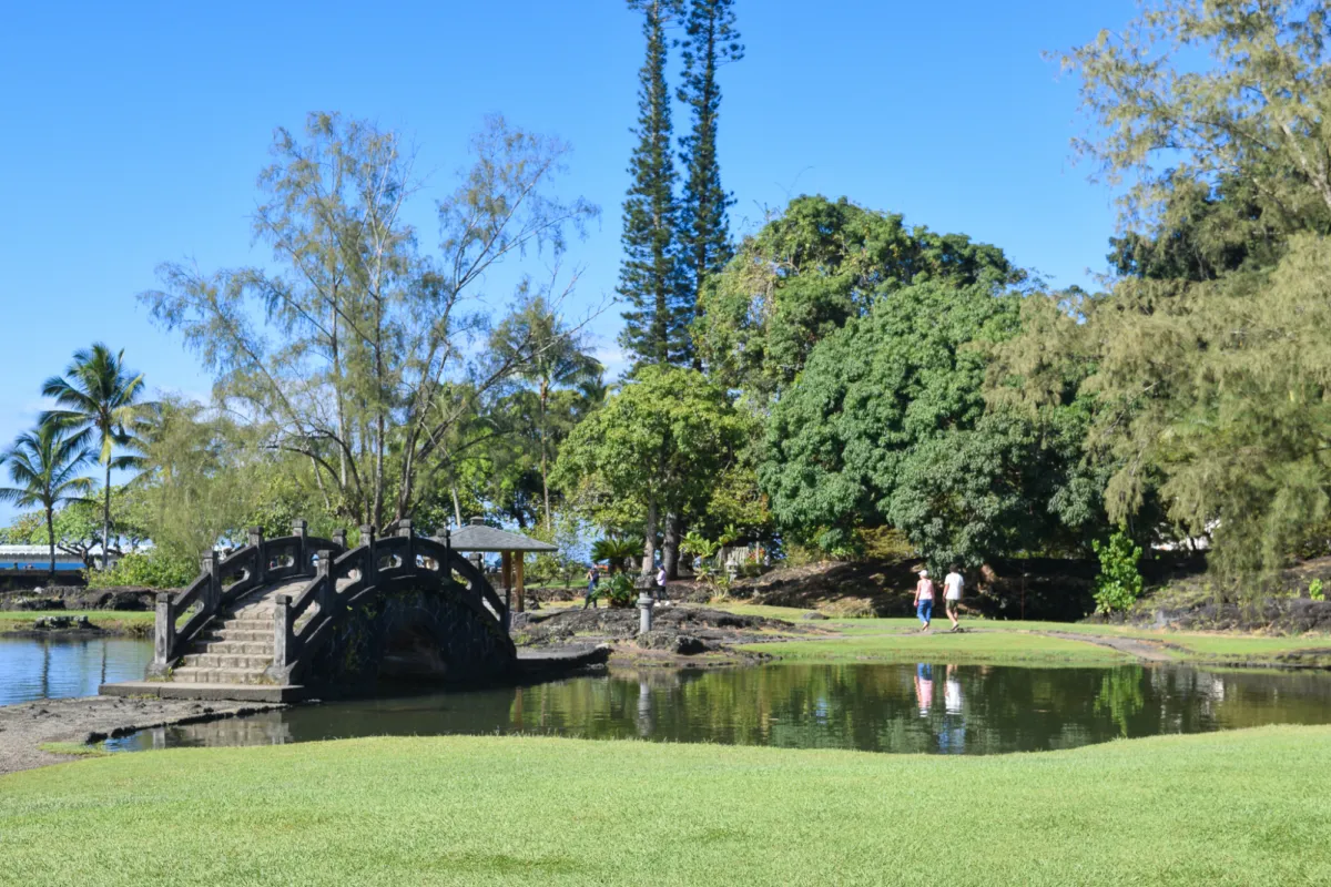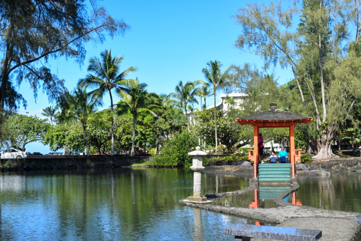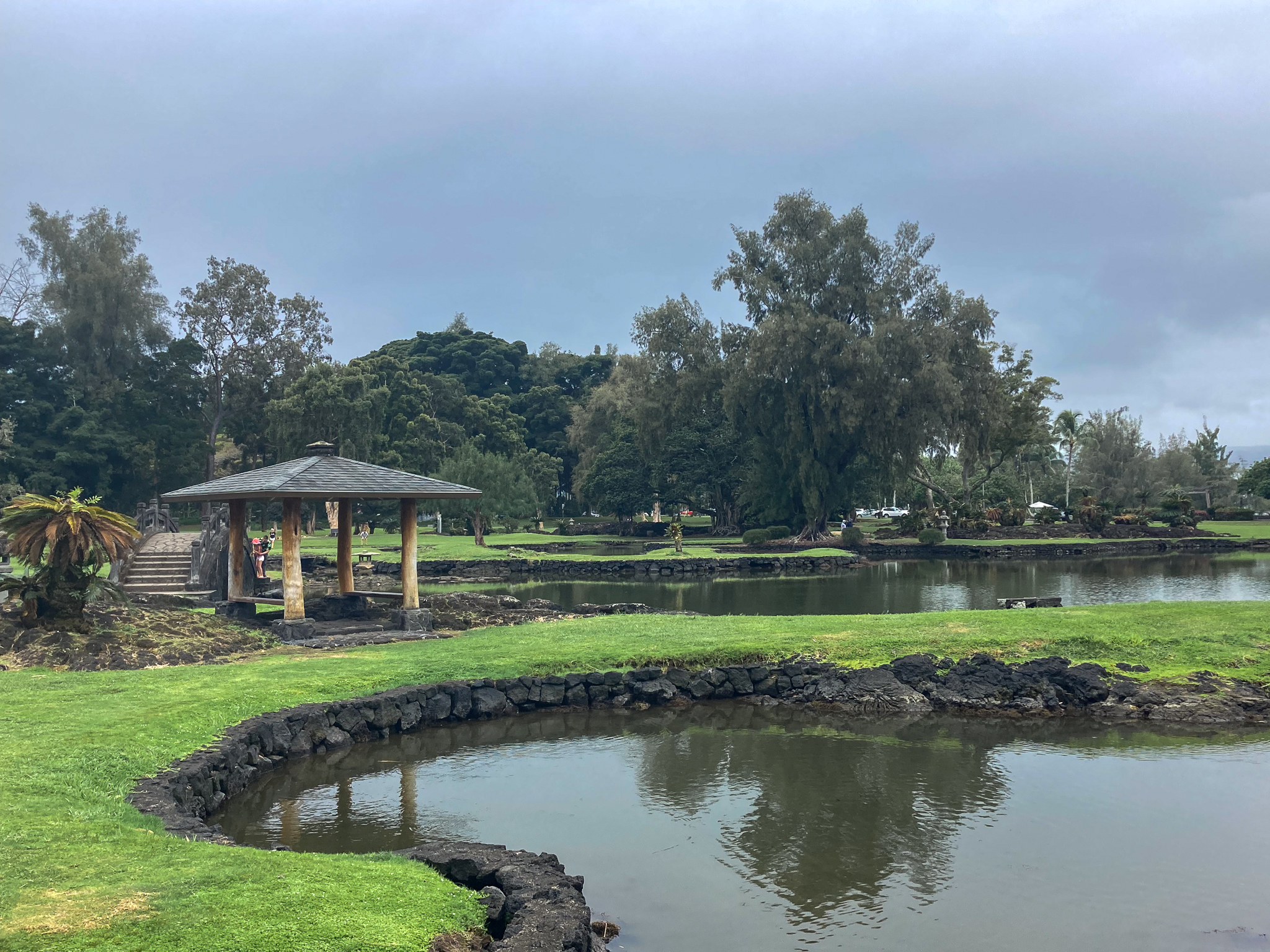 Returning over the Double-Arch Bridge toward the Waihonu Pond at the park’s center, I stop at the Square-Roof Pavilion. First built in 1917 and rebuilt in 2015 with sturdy ʻōhiʻa logs, it’s a quiet place to pause, offering open views back toward the pond and bridges. In Hawaiian culture, the ʻōhiʻa lehua tree is deeply symbolic, tied to legends of love and resilience, and its blossoms are among the first to appear on new lava flows. Using ʻōhiʻa here connects the pavilion to the islands’ natural and cultural heritage.