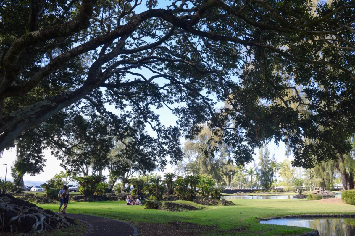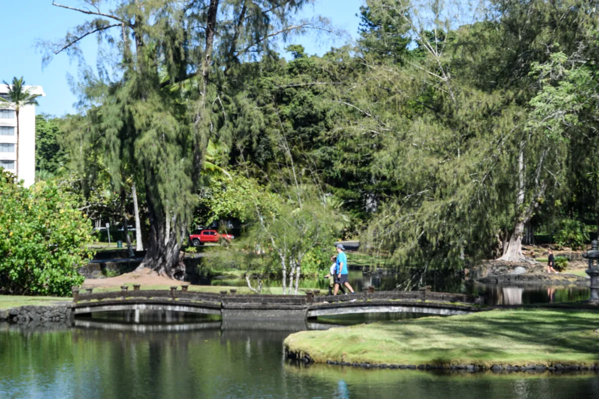 Now I get my first view of Waihonu’s brackish ponds, stretching out like glass and mirroring slow-moving clouds. Banyan canopies stitch shade across the distant paths, their roots twisting down like old ropes, while bridges and lanterns punctuate a green expanse of manicured lawn. I have arrived.
