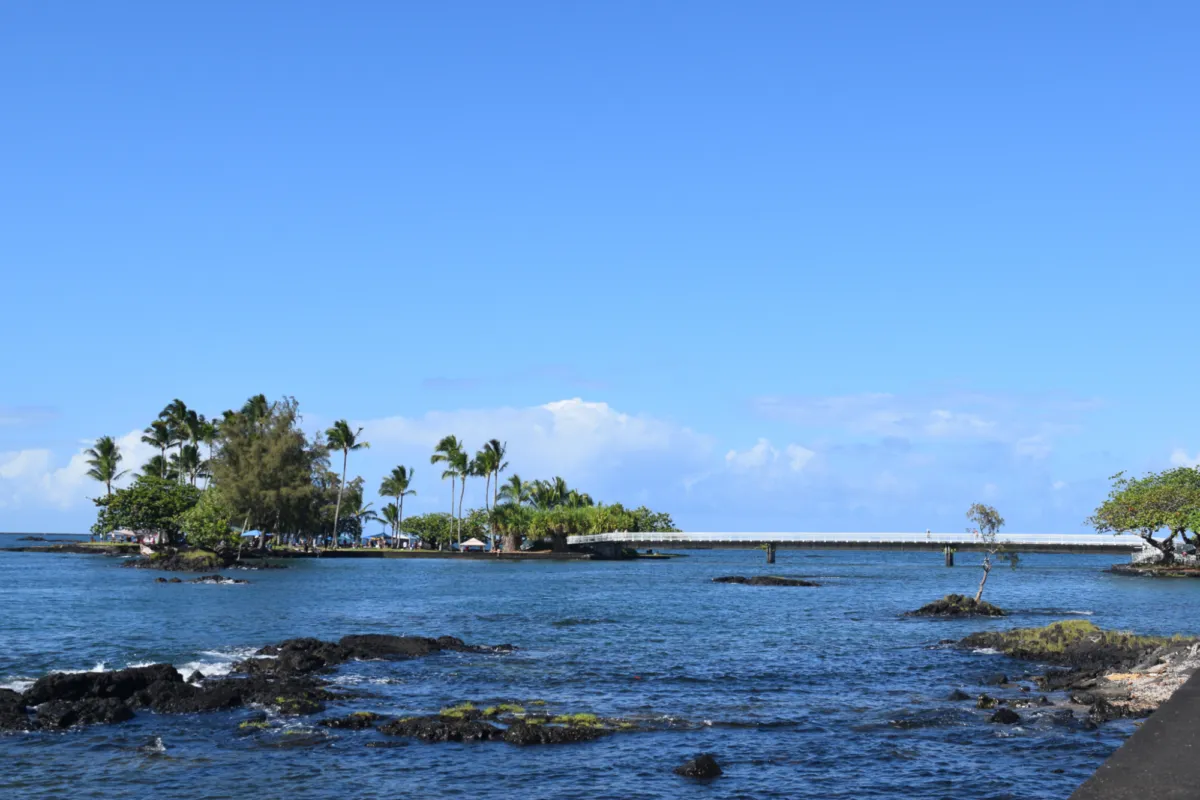 Crossing over, I’m rewarded with a sweeping view of Coconut Island and the long walking bridge that connects it to shore, stretching low across the water like an invitation.