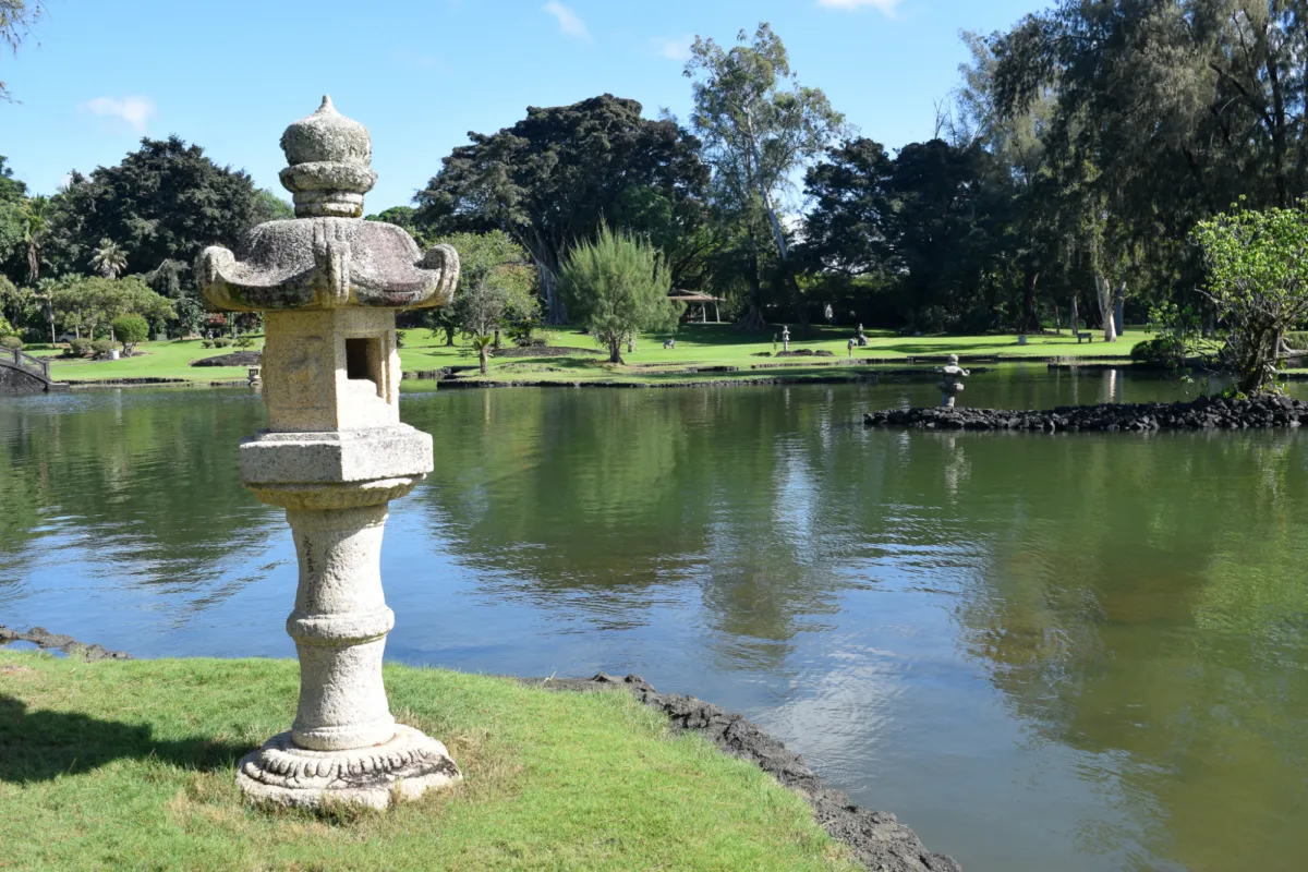 Directly ahead stands the Fukuoka Lantern, a pagoda-style tōrō gifted in the late 1960s to commemorate the centennial of the Gannenmono. The term Gannenmono refers to the first group of Japanese immigrants who arrived in Hawaiʻi in 1868, seeking work on sugar plantations and starting a cultural exchange that still shapes the islands today. The lantern’s tiered roofs catch the light, while moss gathers at its base where it is mounted into black lava rock.