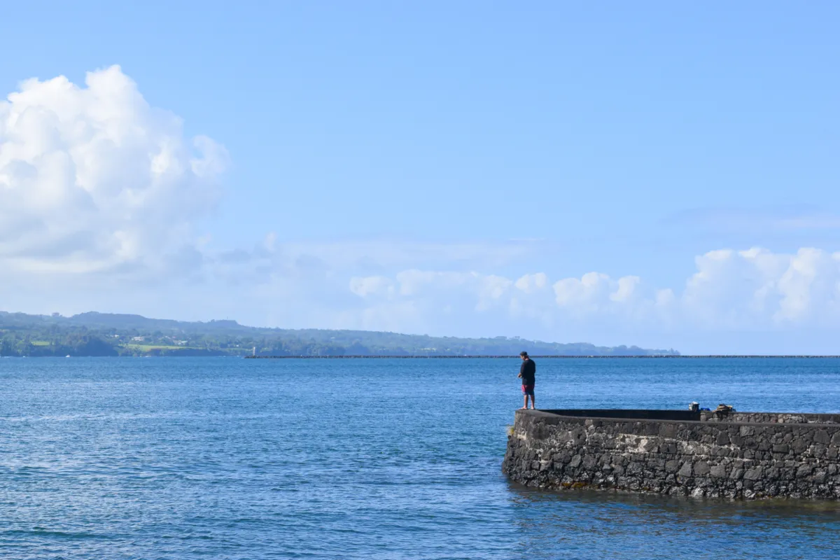 I then like to step out of the park, drawn toward the calm, deep blue waters of Hilo Bay. The color here is a rich, royal blue, shaped by the black lava rock and dark sands that define this coastline. It’s a striking contrast to the turquoise shallows you find along white-sand beaches, instead stretching out in deeper, moodier hues. I cross Lihiwai Street to the Old Hilo Pier, where fishermen stand on the edge with light tackle, often casting for papio (juvenile trevally), aholehole, or the occasional ʻomilu. The coast is sunny, with white puffs of clouds drifting lazily by over the distant Hāmākua shoreline. More than a century ago, Queen Liliʻuokalani came ashore here in a double-hulled canoe; today, the pier is a favorite local fishing spot, with bait often gathered from the Waihonu Pond just across the street.
