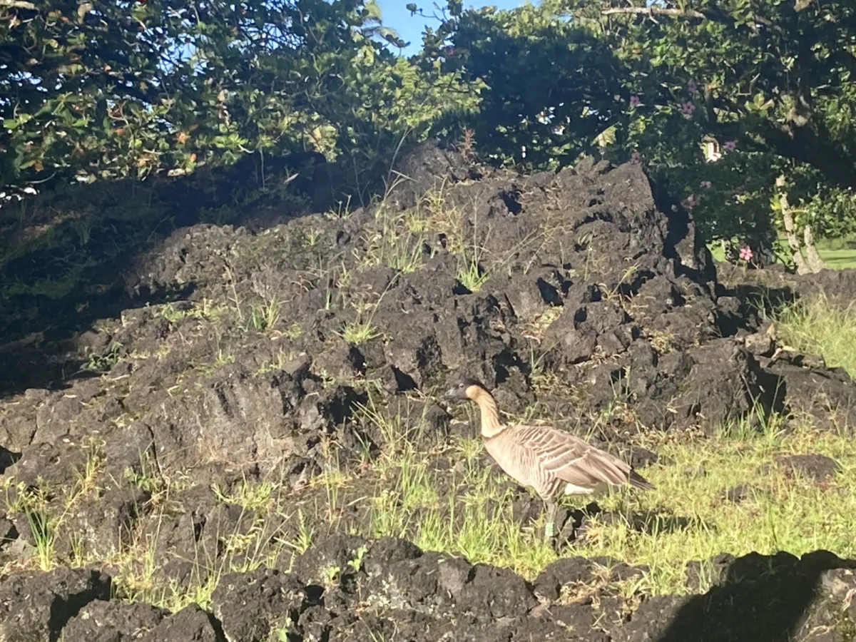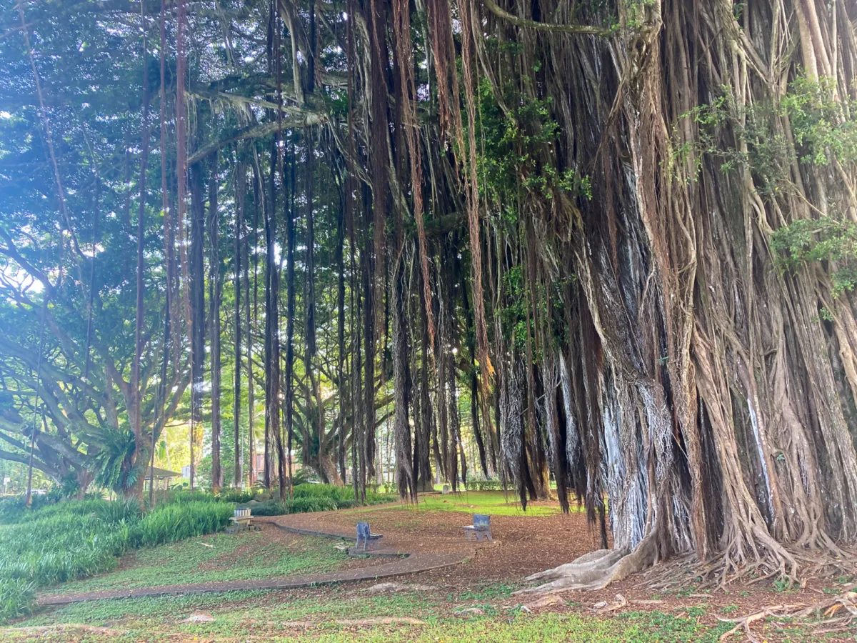 Back in the park, I continue to wander the paths beneath the shade of banyan trees, sometimes pausing on a bench to take it all in. This side feels more open, with the bridges, pavilions, lanterns, and torii gates now behind me. The lawns are dotted with palms of different varieties, and one curious tree leans at an unusual curve as if frozen mid-bow. Nēnē graze quietly in the grass, their muted calls drifting on the breeze. I read a few of the informative placards near the Shichi-Go-San Stone Arrangement, a playful cluster of boulders representing the ages 7, 5, and 3 when children traditionally reach milestones in Japan. Once I feel like I have enjoyed the open space long enough, I eventually meander back toward the car, my ice cream cone long gone.