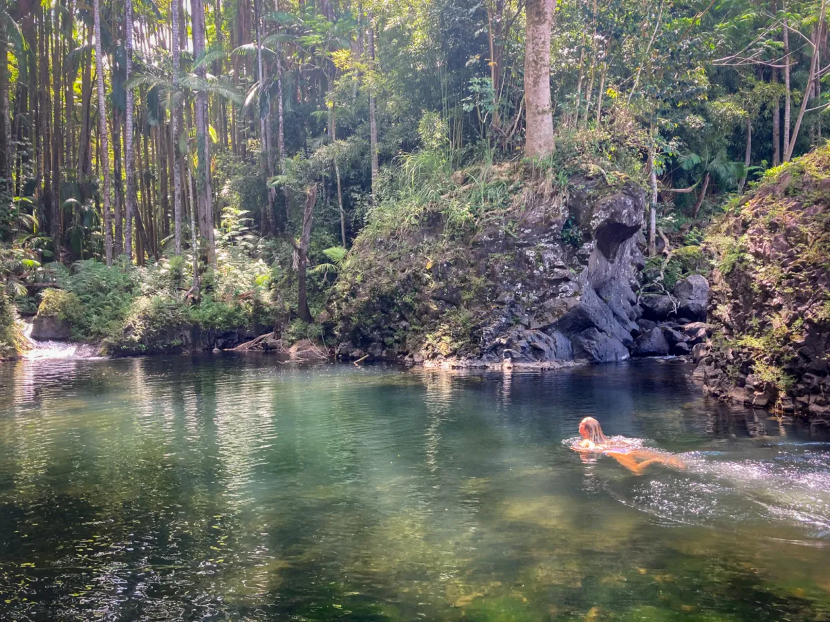 Speaking of boulders, Wailuku swimming holes often have underwater hard to see rocks and submerged ledges, making depth unpredictable. The golden rule? Always check before you jump. Even if you see others taking the plunge, water levels can change with rainfall upstream. What was deep yesterday might be dangerously shallow today. Iâve personally went to jump in butt first on what seemed like a perfect summer day, only to smash my tailbone on an unseen rock. It can happen to anybody and should not be disregarded.Â