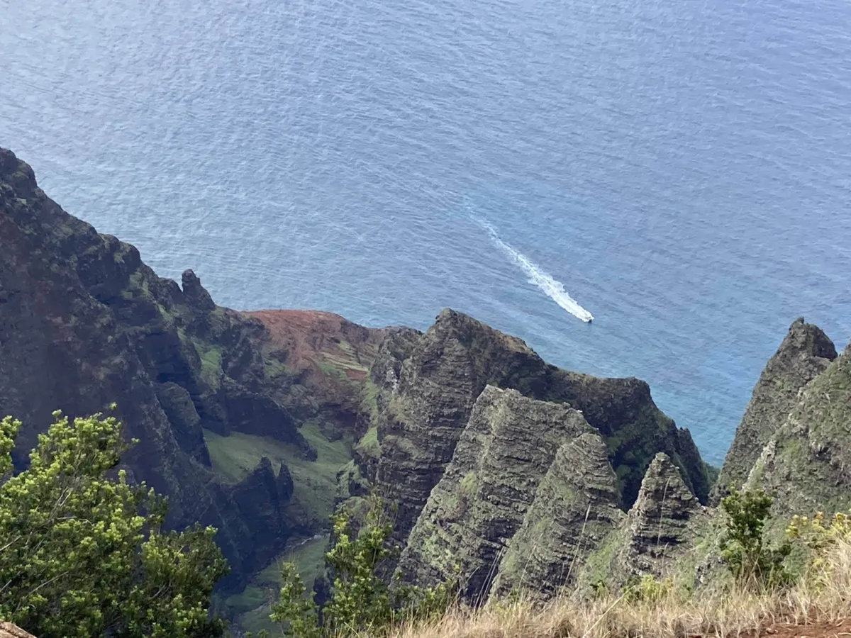 Looking down from these cliffs toward the ocean below, I couldn’t help but imagine the view in reverse, gazing up from the sea at these same towering ridges, their green walls glowing in the sunlight. It’s that very perspective that makes the Nā Pali Coast Sunset Dinner Catamaran so unforgettable, offering guests the chance to see these cliffs from the water as the setting sun paints them gold.