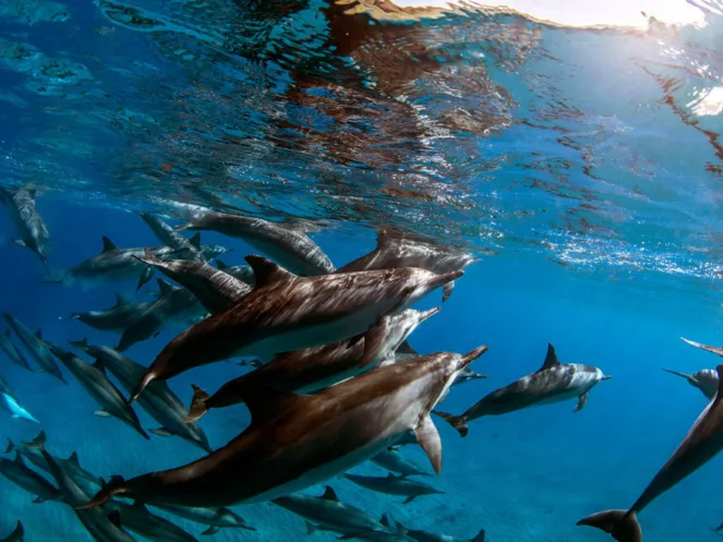 We recently swam with the Wild Spinner Dolphins of Oahu. Their name derived from the acrobatic displays above and below the water. They are known for jumping out of the water and soaring through the air, spinning as many as 6 rotations, before flopping back down. Learn more about Spinner Dolphins in this blog post.